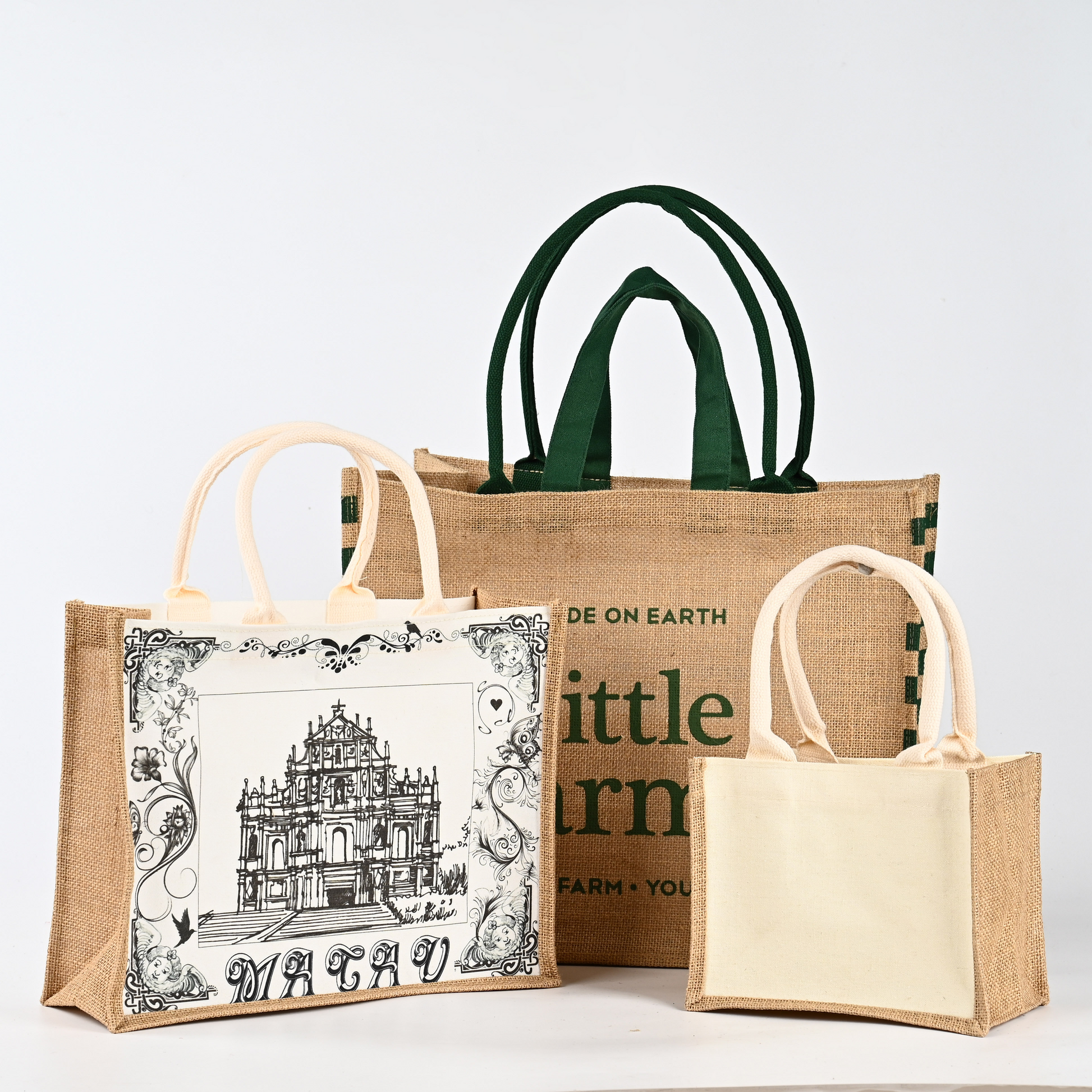 Custom Jute Burlap Beach Tote Bag with Double Long Leather Handles English Letter Canvas Jute Material for Shopping